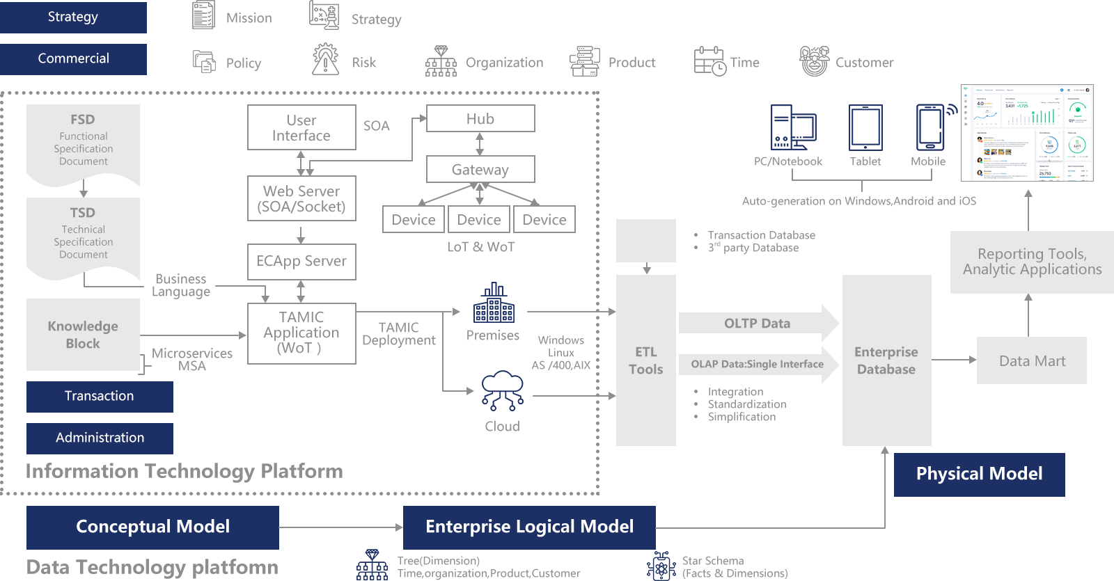 数据按企业数据模型进行组织,能从企业整体或局部灵活地进行数据分析。可以集成万维物联网 (Web of Things)的数据,令更多的数据纳入管理。前台实时产生的各种数据都可纳入TAMIC平台,让实时分析成为可能。